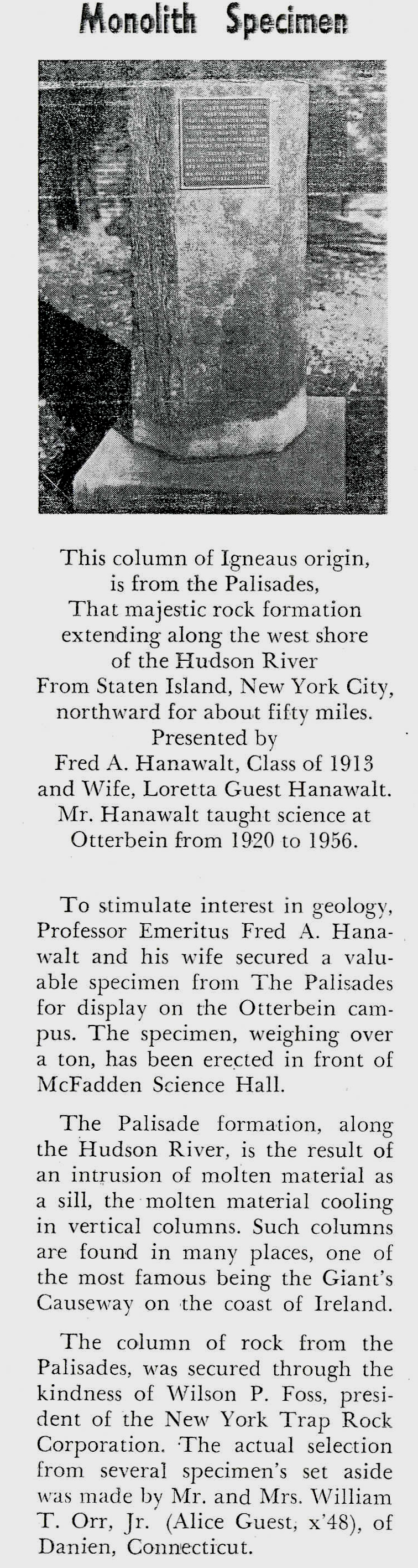 This article from the March 1965 Towers Magazine explains the reason we have a small stone pillar on the southeast corner of the Science Center. Unfortunately the original explanatory plaque no longer adorns the monolith, and subsequent attempts to label the stone have failed.